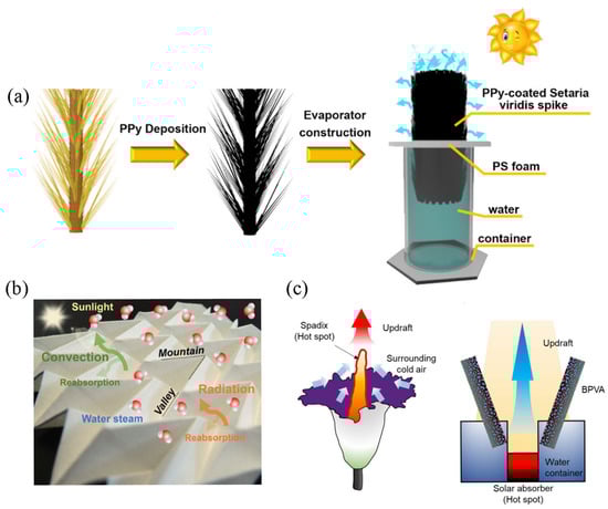 Schematic diagrams of various devices with bionic structures. (a) A solar evaporator inspired by the mushroom form in nature; reprinted with permission from [116], 2022, Elsevier. (b) Sunflower 3D structure inspired device for tracking sunlight; reprinted with permission from [117], 2020, American Chemical Society. (c) Solar evaporator designed to mimic animal scales; reprinted with permission from [118], 2020, Royal Society of Chemistry.