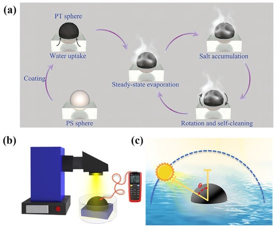 Schematic diagram of the structure of other types of devices. (a) Spherical self-rotating double evaporation zone (high and low-temperature evaporation zones) evaporator; reprinted with permission from [119], 2021, John Wiley and Sons. (b) Structure of a photothermally formed evaporator with inverted bowl-shaped graphene aerogel. (c) Schematic diagram of the incidence angle of sunlight; reprinted with permission from [120], 2022, John Wiley and Sons.