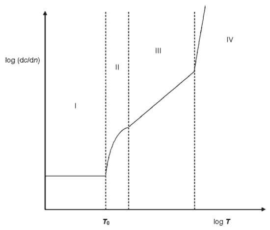 The study of rubber fatigue life dates back to 1940, when Cadwell [6] studied the dynamic fatigue life of natural rubber, followed by Thomas [7], Lake [8], Lindley [9], Rivlin [10], and William V. Mars [11], which was developed over the years to form a whole set of theories, namely the crack extension theory based on fracture mechanics. They combined a large number of experimental data of crack extension under transverse loading, and divided the crack tip energy release rate-crack growth rate into four regions according to the maximum energy release rate in the cycle, as shown in Figure 1 [12], indicates the threshold tear energy, and the peak tear energy of stage I, ≤ , at this stage the crack will not expand due to the external load; is the transition tear energy, which indicates the transition from stage II to stage is the transition tear energy, which indicates the tear energy corresponding to the transition from stage II to stage III; indicates the critical tear energy, when ≥ , the crack reaches stage IV, i.e., the destabilization expansion process. The approximate expressions for the crack growth rates of the four stages are also given, as follows