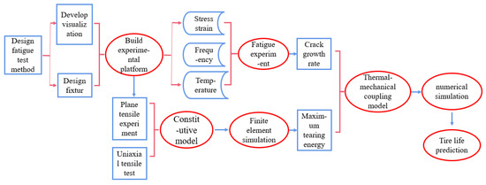 The main purpose of this paper is to build a fatigue experiment platform and design a fatigue experiment method based on the crack propagation method, so as to form a set of evaluation methods for studying rubber fatigue at variable temperature, and then establish a rubber thermal-mechanical coupling fatigue prediction model according to a large number of experimental results, which provides valuable reference for rubber fatigue research. Figure 2 is the technical route of research.