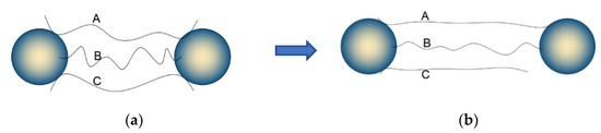 Rubber molecular chain breakage model. (a) the chain is not stretched. (b) the chain is stretched. A, B, and C are molecular chains.