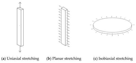 From the previous section, it is known that the crack expansion stage can be divided into four stages, and the third stage is the focus of calculation. To accurately calculate the fatigue life, accurate material parameters should be obtained, and as a polymer material capable of withstanding intense deformation and with nonlinear characteristics, an accurate description of its constitutive model is the key to calculate its fatigue life. From previous studies, it is necessary to fit the experimental data of uniaxial tensile, equiaxial tensile and plane tensile to describe the hyperelastic constitutive model of rubber, and the loading schematic is shown in Figure 9. These three experiments characterize the mechanical behavior of rubber materials in uniaxial tension, uniaxial compression, and pure shear states, respectively, and the alternating loads on rubber products in actual use can be represented by the coupling of these three force states [37].