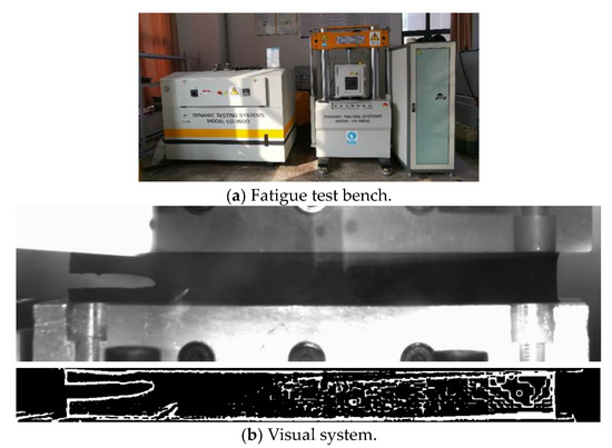 In this paper, based on the relationship between the crack expansion rate and tearing energy established by Thomas et al., the fatigue life calculation model of rubber materials was established in order to obtain the material parameters required for calculating the fatigue life of rubber using the crack expansion method. We designed the fixture, specimen and vulcanization mold used in the shear fatigue experiment of rubber materials and built the planar tensile and fatigue experimental platform according to the characteristics of fatigue experiments, as shown in Figure 13a. Since the conventional fixture is prone to screw loosening after a long period of fatigue experiments, which leads to the problem of the specimen clamping sliding and eventually distorting the stress–strain data during the test, the new fixture and specimen used in this paper can avoid the above problems. These two reasons are likely to lead to errors in the experimental results and affect the accuracy of the subsequent life calculation process. Therefore, after considering various factors, we designed our own fixture and specimen. The designed specimen is vulcanized into a cylindrical shape at the upper and lower ends, and the upper and lower two cylinders are embedded in the cylindrical groove of the designed fixture. The computer can display the tensile stress in real time, and adjust the stress to 0, that is, to reach the initial unstressed state of the specimen, after which the experiment can begin. This fixture can avoid the clamp loosening caused by the screw becoming loose accurately capture any quick changes in any part of the specimen, and also avoid errors caused by the inaccurate height of the single measurement work area. When carrying out fatigue test, a 25 mm crack is preset on one side of the specimen, as shown in Figure 13b, According to fracture mechanics, when the crack length is greater than or equal to twice the height, the influence of edge effect on the shear fatigue test can be ignored. Additionally, the accuracy when measuring the crack expansion length affects the accuracy when constructing the fatigue life calculation model, so this test bench is designed with a vision system for measuring the crack expansion length, as shown in Figure 13b.