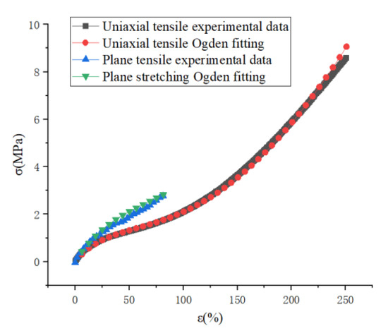 As shown in Figure 14 for the experimental data and simulation data of uniaxial stretching and plane stretching, it can be seen that there is a large gap between the stress-strain curves of uniaxial stretching and plane stretching, and the hyperelastic model needs to be used in calculating the strain energy density of rubber, so for the stress field of the combination of uniaxial stretching and plane stretching, the data of uniaxial stretching cannot be used only, which will cause large deviation, so it is necessary to The uniaxial tensile and planar tensile data need to be obtained simultaneously. In this paper, we use Ogden model to fit the experimental data with a high degree of overlap with the experimental data, which can meet the calculation requirements. The results are shown in Table 1.