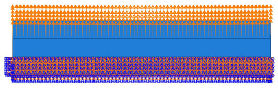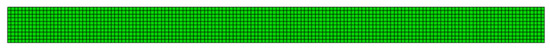 The non-working area of the specimen in this experiment is cylindrical, which is likely to cause convergence problems for the finite element simulation, and deleting this part during the simulation will not affect the simulation results, so the non-working area is removed from the simulation. As shown in Figure 15, the strain energy density is required in the calculation model of ABA fatigue life, and the strain energy density is calculated by finite element simulation in this paper. The size of the rubber fatigue specimen in this experiment is 140 mm × 30 mm × 2 mm, and the size of the working area is 140 mm × 10 mm × 2 mm. As the finite element model is established in QUS, the material parameters are set and submitted for calculation. The maximum strain energy density of the working area is obtained. As shown in Figure 15, the grid division diagram of the finite element model is shown, and Figure 16 shows the loading mode.