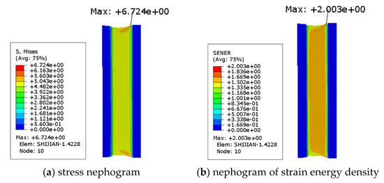There is an edge effect in the calculation of the finite element model, as shown in Figure 17b, which needs to be removed manually, so the maximum strain energy density should be selected after removing the value of the fixture edge. The strain energy densities at different strain levels are shown in Table 2. The maximum tear energy Tmax can be obtained by substituting the maximum strain energy density under different strains into Equation (4).