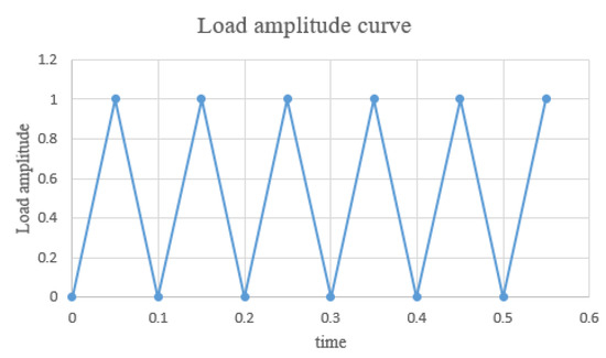 The Mullins effect has an impact on the acquisition of rubber material parameters, so it is necessary to eliminate the Mullins effect of rubber materials when testing material parameters, as shown in Figure 8. The parameters of the rubber materials were first stretched in five cycles, and the data of the sixth stretching were taken.
