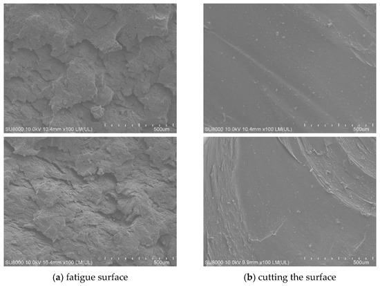 Figure 31 shows the SEM scanning photos of the unfatigued specimens. It can be observed that the fatigue-free interface is smooth, but there are pits. This is because the rubber specimen hardly stretches when it is cut off, so when the material is cut off, the filler sticks to the fracture surface.