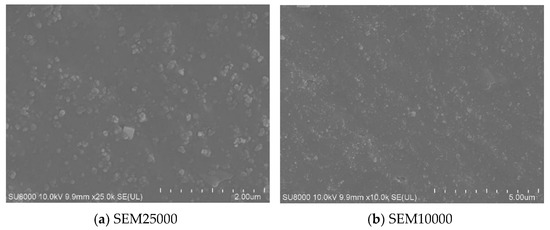Figure 28 shows the fast cut surface of the specimen without fatigue experiments. From the photo with 10,000 times magnification, it can be seen that the fillers are all well dispersed, in which the rubber matrix is the continuous phase and the other fillers are the dispersed phase. And it can be seen from the figure that the infiltration of the filler and the rubber matrix is relatively good, the vast majority of the filler is wrapped in the rubber matrix, and only a small part of the filler particles are not wrapped by the rubber, which is the source of the fatigue cracks in the rubber material.