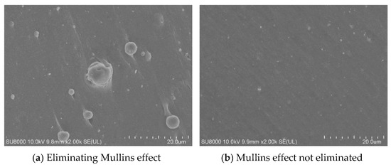 Figure 33a shows a scanning photo of the surface of the rubber specimen cut off with a blade after it has been stretched to 200% strain for six times, and (b) shows a scanning photo of the surface of the specimen that has not been stretched. It can be seen that (b) the surface is smooth and the bonding degree between the filler and the rubber matrix is good, but after the Mullins effect is eliminated, it can be found that some fillers have been separated from the rubber matrix, indicating that the network formed by the filler and the rubber has begun to be destroyed.