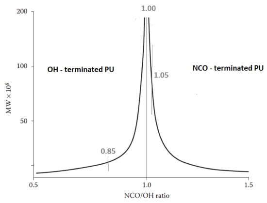 The content of OH groups is due to the INCO and the water content absorbed by the foams during their seasoning. In the case of elastomers made with different INCOs, the average molecular weight (MW) varies; the theoretical relationship between INCO and MW is shown in Figure 2 [33]. At INCOs below 1, polyurethane macromolecules with OH groups are obtained, while at INCOs above 1, they are terminated with NCO groups. The changes in foams MW due to the change in INCO can be expected to be similar. Therefore, PUF_85 contains the most OH groups, and PUF_105 the least with the highest INCO.
