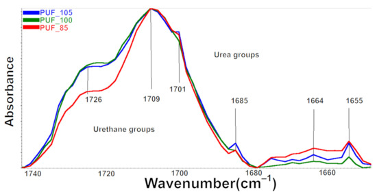 There are differences in the multiplet signal shape, in the wavenumber range of 1750–1640 cm−1 for FTIR spectra between the foams (Figure 3). The differences were related to the change in the intensity of components originating from the stretching vibrations of the carbonyl groups in urethane and urea groups, bound with a hydrogen bond and not bound (Figure 3) [42].