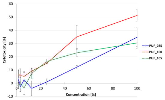 HaCaT keratinocyte cells were subjected to aqueous extracts of three polyurethane foam samples at seven different concentrations (ranging from 1.56% to 100%) with four replicates for each concentration and were exposed for 24 h. The concentration-dependent cytotoxicity curves for each extract are presented in Figure 4 as the mean ± standard deviation (SD) of three independent experiments. The cytotoxicity of all foam extracts remained consistently low, below 10%, for concentrations up to 13%. After that, the cytotoxicity of PUF_85 and PUF_100 foams changed similarly up to a concentration of 25%. Above this concentration, the cytotoxicity of PUF_100 foam increased rapidly up to approximately 50%, the strongest cytotoxicity, while the increase in cytotoxicity for PUF_85 foam was less rapid and increased to approximately 30%. The cytotoxicity of PUF_105 increased at the slowest rate, up to approximately 35%.