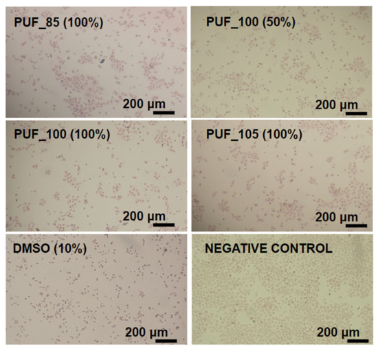 These results are in agreement with the IC50 values (Table 5), as only for this foam could it be determined, and it was 96.1%. For the remaining foam extracts, it was not possible to determine the IC50, as the cytotoxicity was too low, even at the highest concentration tested (100%). Non-toxic concentrations (IC0) were as follows: PUF_105 ≤ 25% and PUF_85 ≤ 12.5%; PUF_100 ≤ 6.25%.
