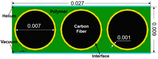 An actual structural was established in the simulation process based on the actual size of the microstructure of the composite component; the detail size in the model is shown in Figure 1. The upper blue part represents high-pressure helium gas, the lower blue part means vacuum, the green parts are the resin, and the yellow part and the black part indicate the fiber–resin interface and the carbon fiber, respectively.