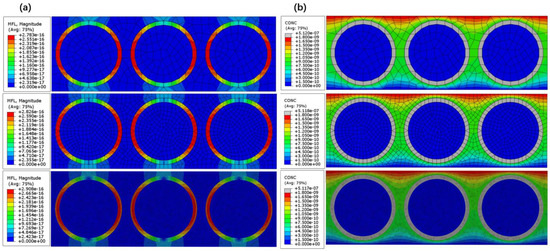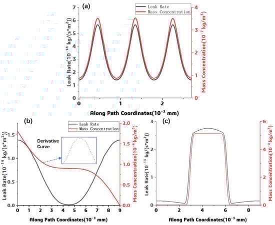 In order to show the simulation result, the leak rate and the mass concentration along each path were extracted and plotted in Figure 7. As shown in Figure 7a, the distribution pattern of the helium leak rate along PATH1 is similar to that of the mass concentration at the escape interface. The leak rate or mass concentration increases near the fiber–resin interface and decreases in the resin. After integrating, the total helium leak rate in the actual structural model was about 8.05 × 10−16 kg/s. For PAHT2 and PATH3, the distributions of the leak rate and the mass concentration are shown in Figure 7b,c, respectively.
