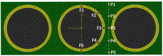 Based on the previous mesh sensitivity study and considering the computational efficiency, the mesh size at the resin and the fiber–resin interface was set to 0.0002 mm, while it was 0.0005 mm at the fibers. The hexahedral element is generated through applying the sweeping method, and the element number in this model is 39,988. In order to obtain the helium gas leak rate and the gas concentration from the simulation result, 10 points marked as F1–F5 and P1–P5 were selected, where F1–F5 is located at the fiber–resin interface and P1–P5 are in the resin. The positions of these points are shown in Figure 3. The simulated data at each point was organized and plotted in Figure 4.