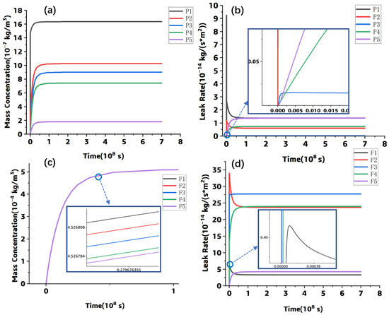 The simulation results: (a) concentration-time curves at P1–P5, (b) leak rate-time curves at P1–P5, (c) concentration-time curves at F1–F5, (d) leak rate-time curves at F1–F5.