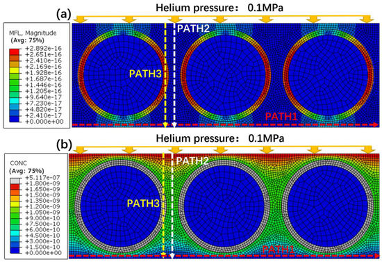 Figure 6 shows the gas leak rate distribution and the mass concentration distribution at the steady state, and three paths marked as PAHT1, PATH2, and PATH3 were marked. As shown in Figure 6a, the gas leak rate at the fiber–resin interface is larger than that in the resin, and the maximum leak rate appears at the horizontal central line. In Figure 6b, the simulated mass concentration at the fiber–resin interfaces is the largest and distributed uniformly, while in the resin, the mass concentration decreases along PATH2. In summary, the leak rate and the mass concentration at the fiber–resin interface are higher than those at the resin, and it can be confirmed that the fiber–resin interface is the main leak channel.