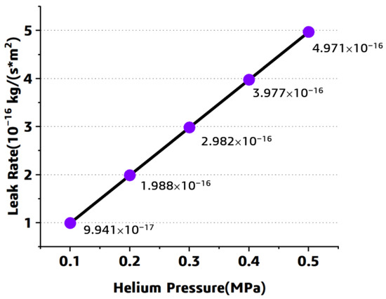 As shown in Figure 7b,c, the helium gas leak rate distributed symmetrically along the horizontal central line, the mass concentration decreases along the PATH2 direction. This simulated relationship among the leak rate and the mass concentration can be explained by Formula (5), the leak rate is in proportion to the derivative of concentration with respect to displacement. In Figure 7c, a sharp increase of the mass concentration and the leak rate can be observed when the path passes through the fiber–resin interface, it can be attributed to the significant difference in the helium gas leak rate and the concentration of the resin and the fiber-resin interface. Meanwhile, the leak rate under different helium pressure was investigated through this numerical approach through adjusting the pressure load, and the results are shown in Figure 8. A linear relationship among the helium pressure and the component leak rate can be observed.