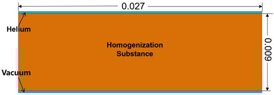 Based on the dimensions in the previous actual model, a homogenized numerical model was established, and shown in Figure 9. The upper blue part represents high-pressure helium gas, the lower blue part means vacuum, and the middle orange part represents the homogeneous material. The boundaries in this homogenized model are the same as with the set in the previous model.
