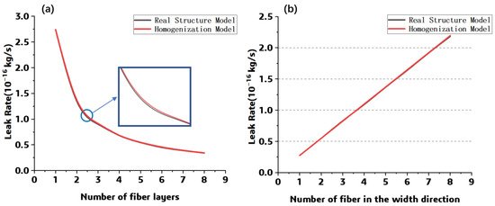 The overall leak rate for each model was obtained by integrating the leak rate at the bottom of the model, as shown in Figure 11. For the models considering the thickness, the maximum difference in leak rate among the previous model and the homogenized model is 2.62 × 10−21 kg/s, while as the width is introduced, the maximum difference between each simulated result is 1.21 × 10−20 kg/s. Through comparison with the simulated leak rate from the previous model, it can be found that the prediction error of the homogenized model is less than 2%.