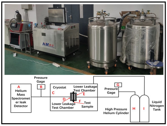 An in-house leak test system at low temperature was used in this study, as shown in Figure 14. The leak test system mainly consists of high-pressure helium cylinders, helium mass spectrometer leak detectors (Hua Er Sheng Intelligent Control Technology Co., Ltd., Shenzhen, China), upper and lower leak testing chambers, liquid nitrogen cryogenic boxes (HM, Shanghai, China), pressure sensors, liquid nitrogen tanks, and so on [21]. The helium mass spectrometer leak detector is used to measure the leak rate, and the accuracy is 1 × 10−15 Pa·m3/s.