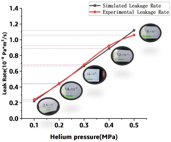 The experimental data demonstrated that the leak rate increases with the pressure; it is consistent with the simulation results. Meanwhile, it can be found that the simulated leak rate is close to the numerical data, and the error between the simulated and experimental results is within 20% in the range of 0.1 MPa to 0.5 MPa. It can be concluded that the simulation and experiment are in good agreement.