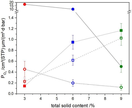 Oxygen permeability coefficients for the coating layers depending on the solid content of the barrier lacquer: The colors red, blue, and green represent the solid content of the barrier lacquers of 3, 6 and 9, respectively. The square symbols represent the slot-die coating, and the circle symbols represent the reverse gravure coating. A filled symbol represents the higher shear rate within a solid content, i.e., the quadrangular roll in the reverse gravure technique and the thin shims in the slot-die (300 for 9, 200 for 6, and 100 for 3). The empty symbol represents the lower shear rate within a solid content, i.e., the trihelical roll in the reverse gravure technique and the thick shims in the slot-die ( 500 for 9, 300 for 6, and 200 for 3).