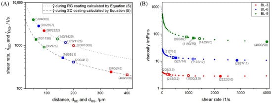 The difference between reverse gravure and slot-die coating in terms of shear rate is best described using an example, i.e., BL-9. Sample BL-9 was sheared at 1190 and 926 and distances of 70 and 90 , respectively, during the slot-die process but at 4000 and 1429 and distances of 50 and 140 during the reverse gravure process. Within the slot-die coating, BL-9 was sheared at 925 for a shim of 300 but at 1190 for a shim of 500 . Within the parameter set of the thicker shims, as indicated by the filled symbols in Figure 4A, the shear rate decreased from 1190 to 245 due to the distance increasing from 70 to 340 for solid content decreasing from 9 to 3. The shear rates during the slot-die process were lower than those occurring during the reverse gravure process. Within the slot-die process, it was found that the shear rate decreased with a decreasing shim thickness (increasing distance between die and web) within one solid content or with a decreasing solid content. The distances, and , were adjusted in a way to provide the best coating picture and were measured for every coating parameter set. In this context, a good coating picture means a wet coating layer without any ribbings, striations, voids, or other inhomogeneities. The highest possible distance providing a good coating picture is preferred for the barrier lacquers, as was demonstrated by Creel et al. [] for polymer electrolyte fuel cell cathode ink. Bhamidipati et al. [] showed that the potential for air entrainment is higher for higher viscosity and that it can be reduced by reducing the distance from die to web. This finding was applied within this study, since an air entrainment would lead to the aforementioned inhomogeneity and needs to be avoided. Even if entrained bubbles in the liquid coating layer are not visible during coating, they still result in an inhomogeneous appearance after drying. This is due to the fact that the thermal expansion coefficient of gases is three times higher than that of solids, and the encapsulated bubbles almost burst open during drying []. The viscosity of BL-9 was higher than that of BL-3 (see Section 3.4), for which reason the distance was lower for BL-9.