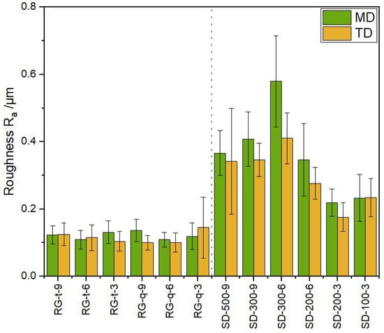 The roughness was measured via direct mechanical contact over the surface with a Hommel Tester W55 from Hommelwerke (Villingen-Schwenningen, Germany). For each sample, 5 lines with a length of were measured parallel (MD) and perpendicular (TD) to the coating direction, and the roughness is given as an arithmetic mean value () of these 5 measurements, respectively.
