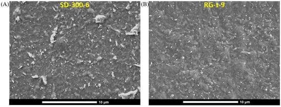 Top view SEM image of the coated substrate with a magnification of 5000: (A) SD-300-6 (B) RG-t-9.