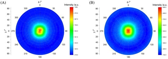 Pole figures were measured using a PANalytical MRD X-ray diffractometer (Almelo, The Netherlands) equipped with a Eulerian cradle employing two-axis scans along and . Measurements were performed at a fixed angle of 6, corresponding to the angle position of the lattice plane (002) studied. To plot pole figures, the intensity distribution was measured along the axis from 0 to 360 at sample tilts from 0 to 85, with an increment of 5 each.