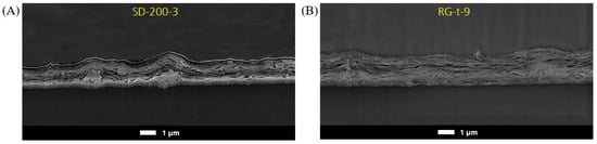 The SEM cross-section images of the same sample pair (see Figure 8) reveal that the MMT particles are oriented horizontally with respect to the substrate surface, because a dominating direction of the bright lines is recognizable from left to right, i.e., parallel to the surface. However, regions having certain tilt angles are also present, especially around agglomerations, e.g., in SD-200-3. It is important to keep in mind that a cross-section image only represents a small partial section of the whole sample. Therefore, the quantitative measurement with pole figure is more reliable for orientation investigation, because an average of a larger area is evaluated. The cross-section images confirm the findings described in Section 3.5, i.e., that the number of agglomerations is higher in slot-die-coated samples than in reverse-gravure-coated samples. Additionally, the cross-section image demonstrates that the agglomerations are not necessarily located on the surface but also within the layer.