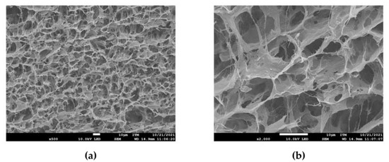 SEM micrographs of the SS/CMC/PVA hydrogel are shown in Figure 1. Notably, the processing method allows the formation of a porous structure. Physical crosslinking mechanisms, such as hydrogen bonding, electrostatic attractions, and ion–dipolar complexes, domain the formation of an interconnected pore structure [57,67,68]. Moreover, planar pore layers could be associated with interactions between SS and CMC that lead to the formation of SS sheet-like structures [69].