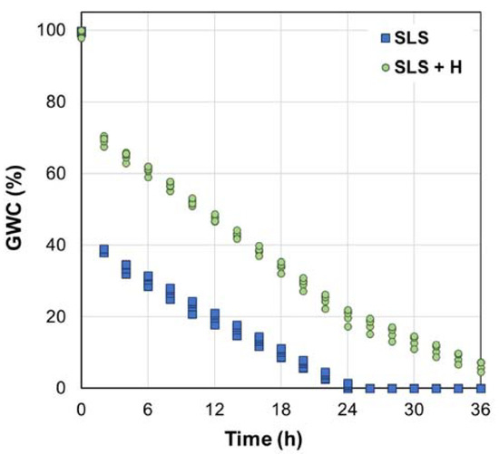 Soil moisture content data obtained at 40 °C and 50% RH. SLS: sandy loam soil; SLS + H: soil + hydrogel.