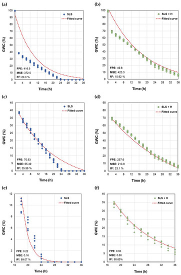 For the linear model, the function sections for SLS and SLS + H were associated with the occurrence of accelerated drainage, slow drainage, and evaporation, which is reflected in the fact that the adjustment yielded a different gain for each section. When comparing the models by sections, it was found that in that associated with slow drainage (2 < t ≤ 24 h), the slopes do not present a significant difference, which may indicate that the phenomena of slow drainage and evaporation between these systems do not differ considerably. However, in the same section, it was observed that the SLS + H system presented a higher intercept (~74%) than that in the SLS (≈40%) in the slow drainage interval, suggesting that the hydrogel has a greater incidence over water retention in the accelerated drainage stage.