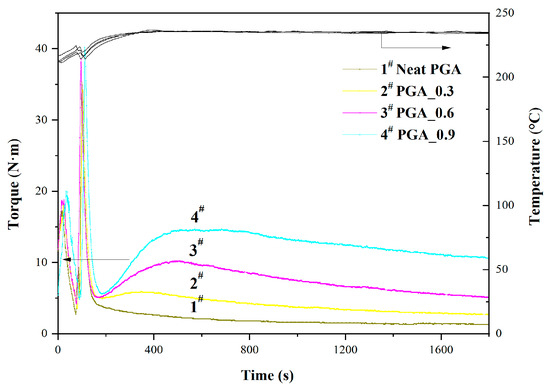 Curves for torque values of the neat PGA and modified PGA samples at 235 °C.