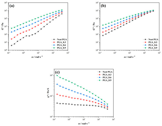 The dynamic rheological behaviors of the neat PGA and modified PGA were further characterized and analyzed using a rotary rheometer. Figure 3a–c shows the storage modulus (), loss modulus (), and complex viscosity () curves of the neat PGA and modified PGA, respectively.