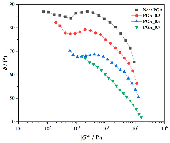In order to better understand the topological structures of the neat PGA and modified PGA, the van Gurp–Palmen (vGP) plots of these samples are shown in Figure 7.