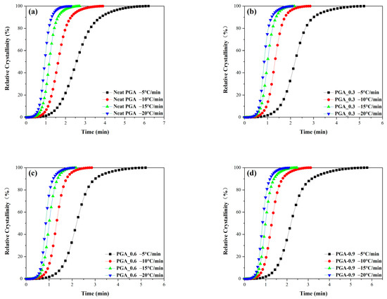 where is the crystallization temperature at time , and is the cooling rate. Figure 9 shows the relative crystallinity curves of the neat PGA and modified PGA as a function of time at different cooling rates.