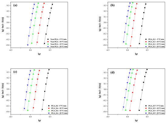Linear fitting plots of and . (a) Neat PGA; (b) PGA_0.3; (c) PGA_0.6; and (d) PGA_0.9.