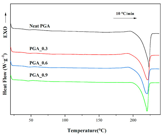 First heating DSC thermograms of the injection-molded samples of neat PGA and modified PGA.