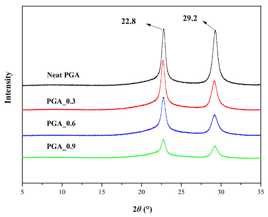 The WAXD analysis was conducted to understand the impact of the ADR content on the PGA crystal structure. Figure 12 presents the WAXD patterns of the neat PGA and modified PGA in the 2 range of 5–35°.