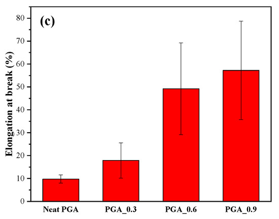 The tensile properties of the neat PGA and modified PGA are summarized in Figure 13, and their typical tensile stress–strain curves are shown in Figure S3.