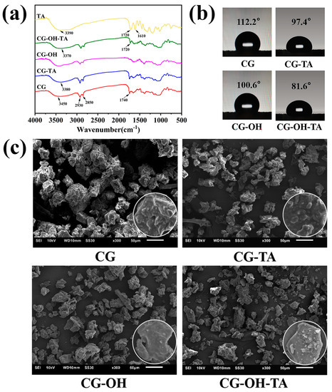 (a) FTIR spectra; (b) water contact angle; (c) SEM images of CG and modified CG.
