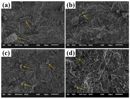 By observing the fracture morphologies of PBAT/CG composites acquired by quenched liquid nitrogen, SEM revealed the dispersion and interfacial adhesion of CG in the PBAT matrix (Figure 3). As seen in the fracture morphology of PBAT/CG composites, the addition of CG increased the heterogeneity of PBAT blends owing to the different sizes of CG particles and uneven dispersion [42]. The formation of larger CG particles was attributed to CG self-agglomeration.