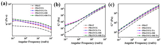 The rheological properties of PBAT and its composites were analyzed to confirm the adhesion of CGs in the PBAT matrix. All samples were in a completely molten state at 160 °C. The complex viscosity (η*) of PBAT appeared to plateau at low and medium frequencies, while it exhibited shear thinning with increasing frequency. This phenomenon was more significant for the composite samples. Furthermore, the incorporation of CGs would hinder the movement of PBAT molecular chains [45]. Compared to the PBAT/CG composite, the η* of modified-CG composites slightly increased, which shows that the modification enhanced the adhesion of CGs and PBAT. As shown in Figure 4, CGs have a reinforcing effect in the PBAT matrix, as the η*, storage modulus (G′), and loss modulus (G″) of PBAT/CG composites were higher than those of neat PBAT [46]. Under the action of TA, the interfacial adhesion between CGs and PBAT is due to the hydrogen bonds and the interfacial adhesion with weak interaction forces. Therefore, the η*, G′, and G″ of modified composites did not significantly increase in rheological curves.