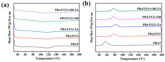 DSC curves from (a) the first heating and (b) the cooling of PBAT and PBAT/CG composites.