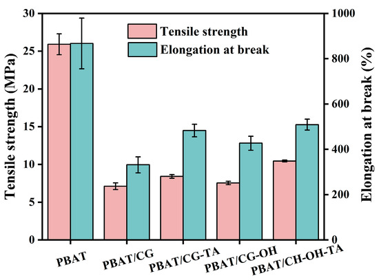 The tensile properties of neat PBAT and PBAT composites are shown in Figure 6. PBAT has excellent tensile properties with good tensile strength (~25.9 MPa) and an excellent elongation at break (~867.1%). In contrast, the direct incorporation of 30 wt% CGs into PBAT would reduce the overall tensile properties of the prepared composites. Indeed, the tensile strength and elongation at the break of the PBAT/CG composite decreased to 7.1 MPa and 331.2%, respectively. This may be explained by the agglomeration of CGs, the weak interfacial adhesion of CG in PBAT matrix, and reductions in the continuous region of PBAT, as shown in SEM images.